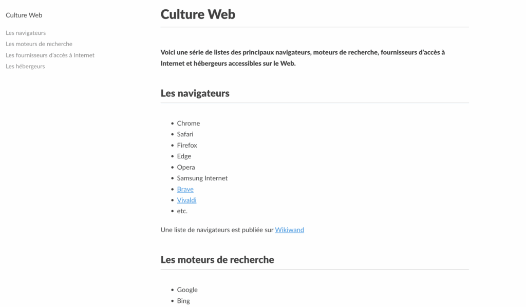 La liste affichée en haut à gauche de la page fonctionne comme un menu en colonne latérale, permettant de naviguer dans la page, de titre h2 en titre h2.