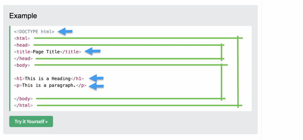 Je vous montre maintenant la structure HTML d’une page Web simple , disponible sur le site w3schools.com… en anglais. En cliquant sur le bouton “Try It Yourself”, vous pourrez visualiser un aperçu de cette page Web dans une fenêtre de prévisualisation.